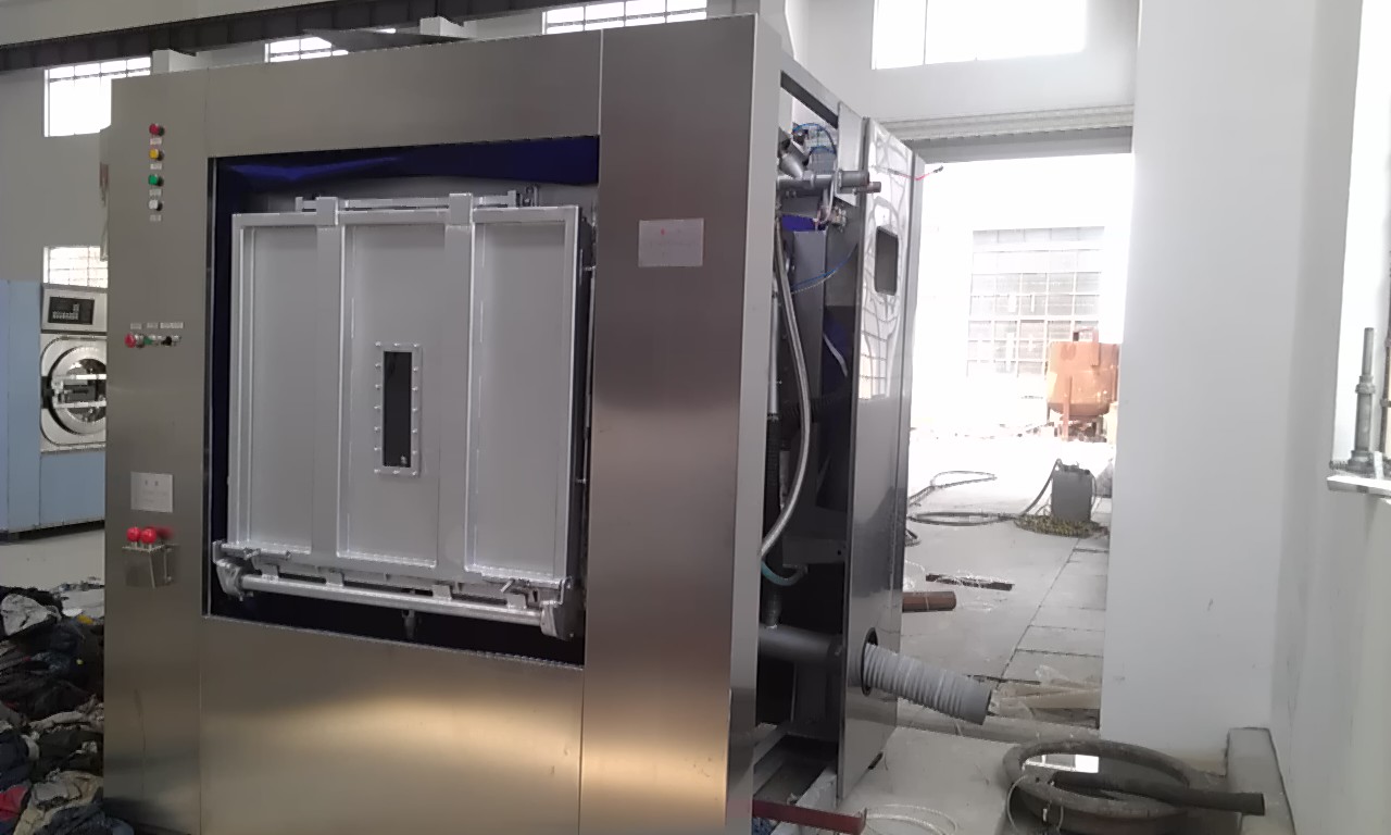 首先,從設(shè)備上采取的衛(wèi)生隔離式洗衣機。背靠背的兩道機門,使污染布草的裝載和潔凈布草的卸載從不同的兩個門進出,從源頭上避免了交叉感染。